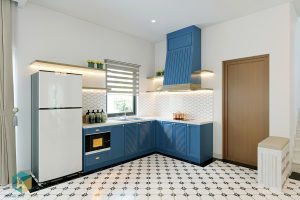 Tủ bếp xanh dương hòa quyện cùng gạch trắng vân mây, mang lại cảm giác tươi mới.